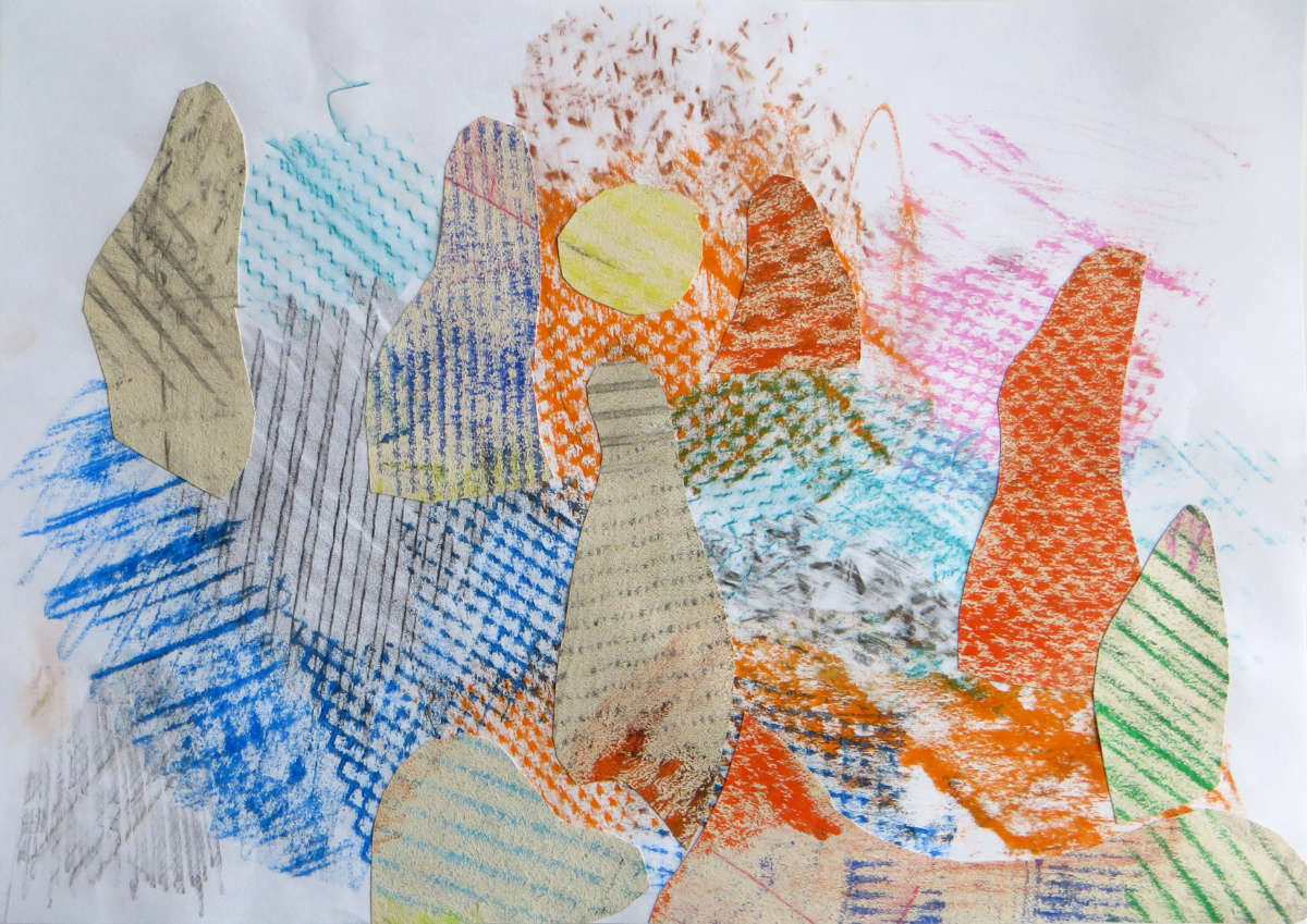 Durch Abreiben von Oberflächen mit Stiften oder Kreiden lassen sich Strukturen auf ein darübergelegtes Papier übertragen. Da diese unweigerlich die Fantasie anregen, werden sie Ausgangspunkt für Interpretationen. Welche Landschaft, welches Fabelwesen hast du ent- deckt? Spielerisches Kombinieren von Elementen lässt Bildfindungen bewusst erleben.